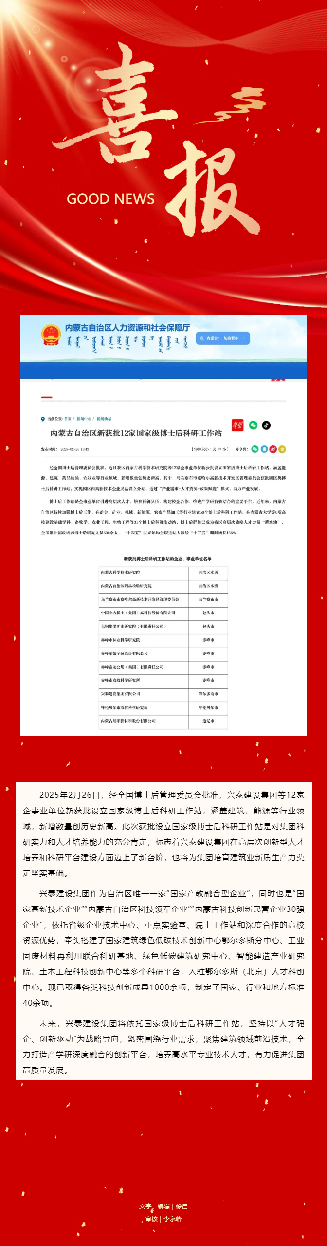 喜报 | 兴泰建设集团获批设立国家级博士后科研工作站
